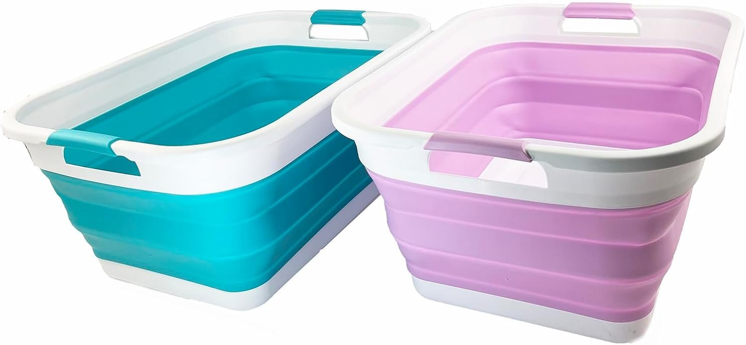 41L (10.8 gallon) Collapsible Plastic Laundry Basket – Foldable Pop Up Storage Container/Organizer – Portable Washing Tub – Space Saving (Rectangular, Ceramic Blue+Pale Purple (Set of 2))